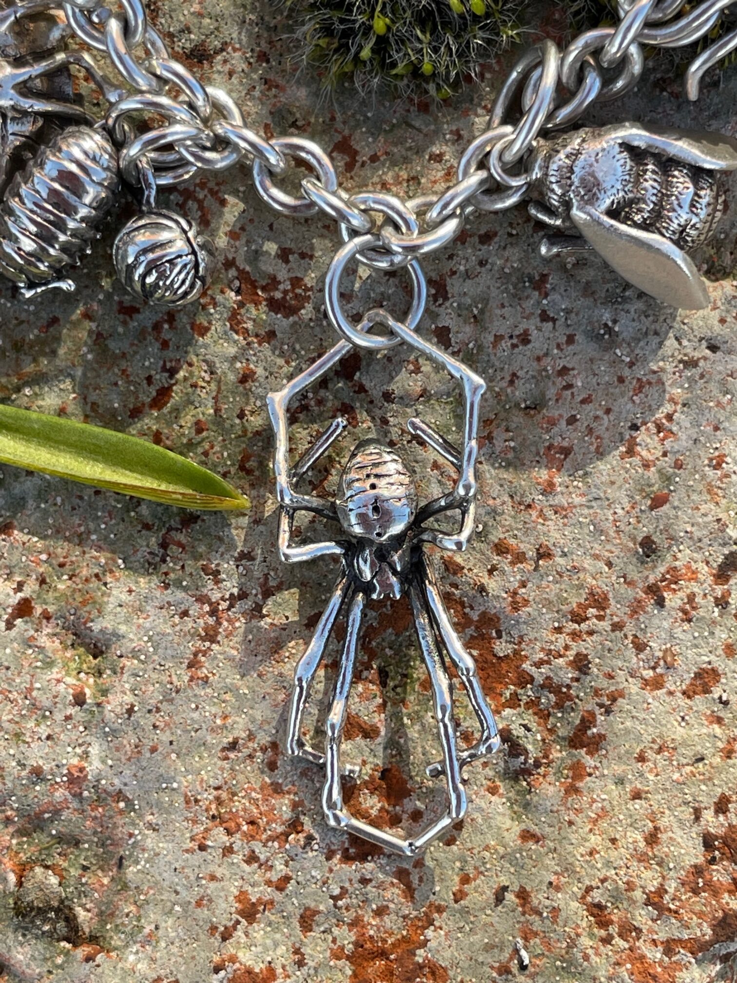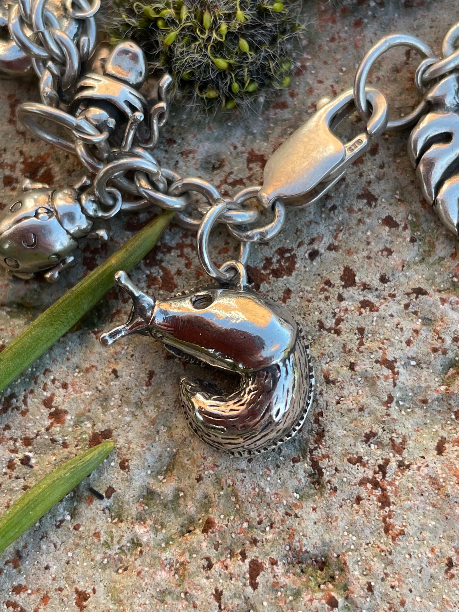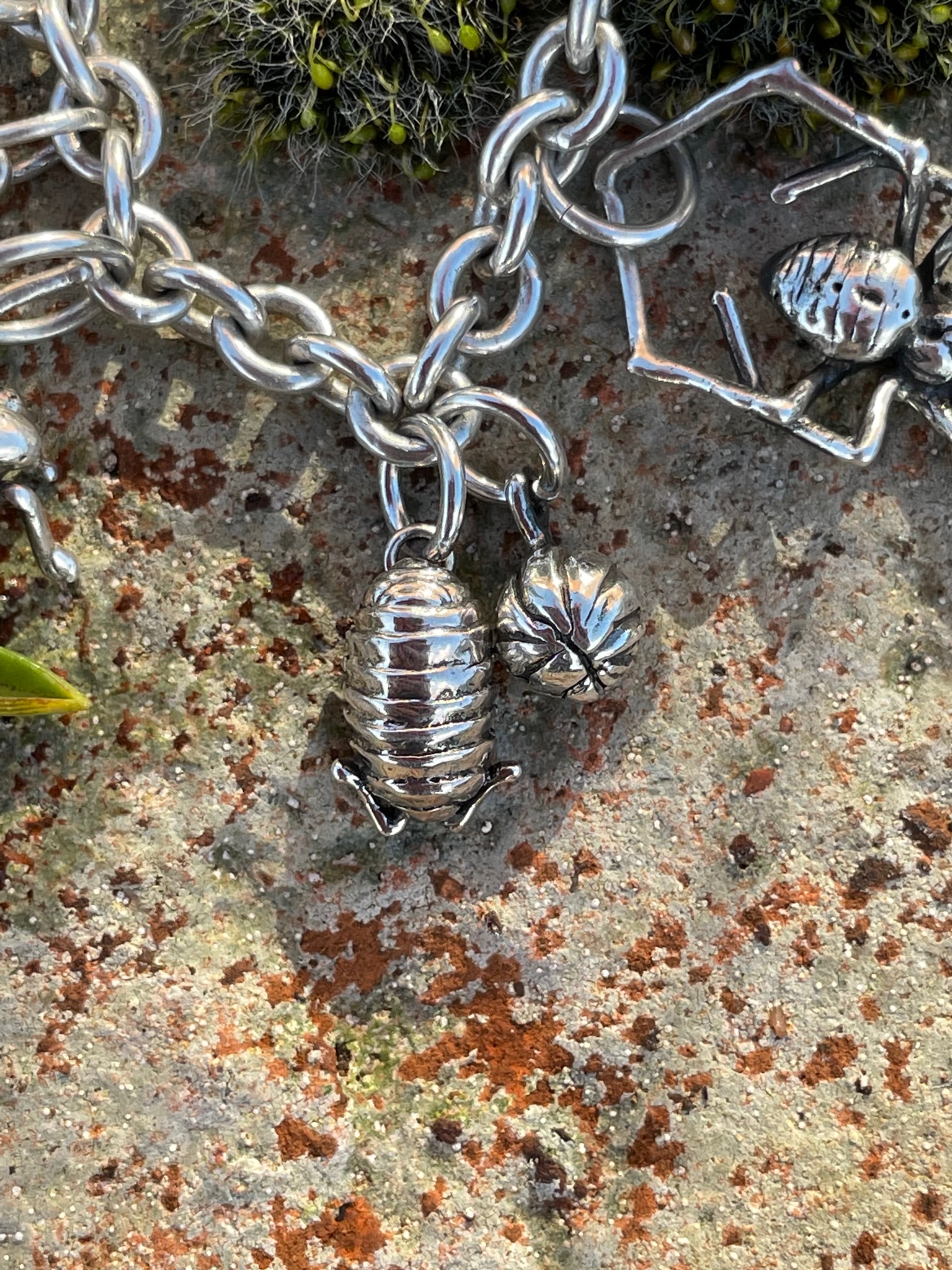 The bracelet itself is made from a robust cable chain, with a little bumblebee attached holding the hallmark and is secured with a fine safety chain (see separate listing for Charm Bracelet). Currently the choice of bracelet charms includes: bumblebee, daisy, earwig, ivy leaf, shieldbug, horse chestnut leaf, green sea turtle, tree frog, monstera leaf, ladybird, moon moth, dragonfly, fly (aka dinner), woodlouse (open and closed), moon moth, spider, slug, snail, scorpion, baby shark and frog on lilypad. But the list is growing all of the time. They can be purchased together or collected over a period of time, in the old tradition of charm bracelets.