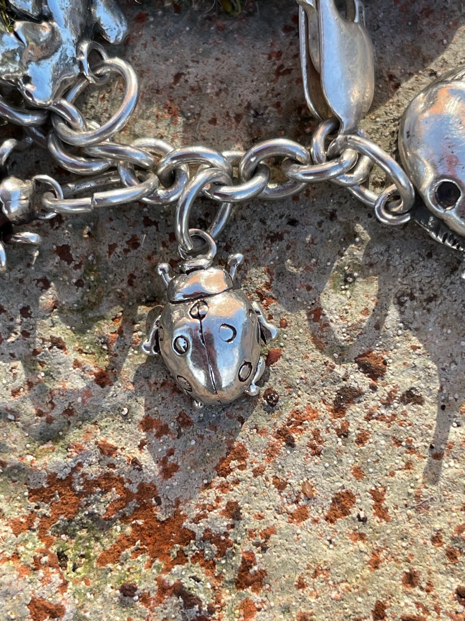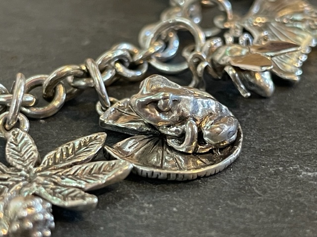 I have coveted charm bracelets since childhood. But it was many years later, in my late 40’s that I finally got my own charm bracelet, inherited from my late mother-in-law. I love running them through my hands, examining the details of each individual charm – knowing that they all have their own individual meaning. So when Claudine from Concept (one of my first galleries) suggested a charm bracelet, I leapt at the chance. Although it is an old-fashioned idea, I greatly enjoy seeing how many others share my passion for these unique items of jewellery.
