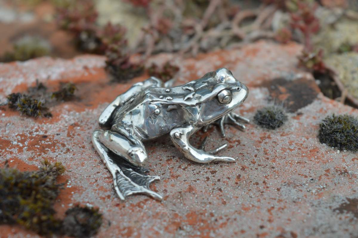 If you have read any of the other pages on my website, you will already know of my great love of frogs: My first jewellery sketch was of a frog and a lilypad; the first piece of jewellery I made was a (tree) frog; my logo is a frog, and so it goes on. Frogs now make up the largest group by far in my collection. And, just when I think I’ve modelled my last frog – another one hops in. This common frog ornament was modelled to accompany a growing collection of native British creatures (all modelled by me), each representing a particular memory in a long and happy marriage.