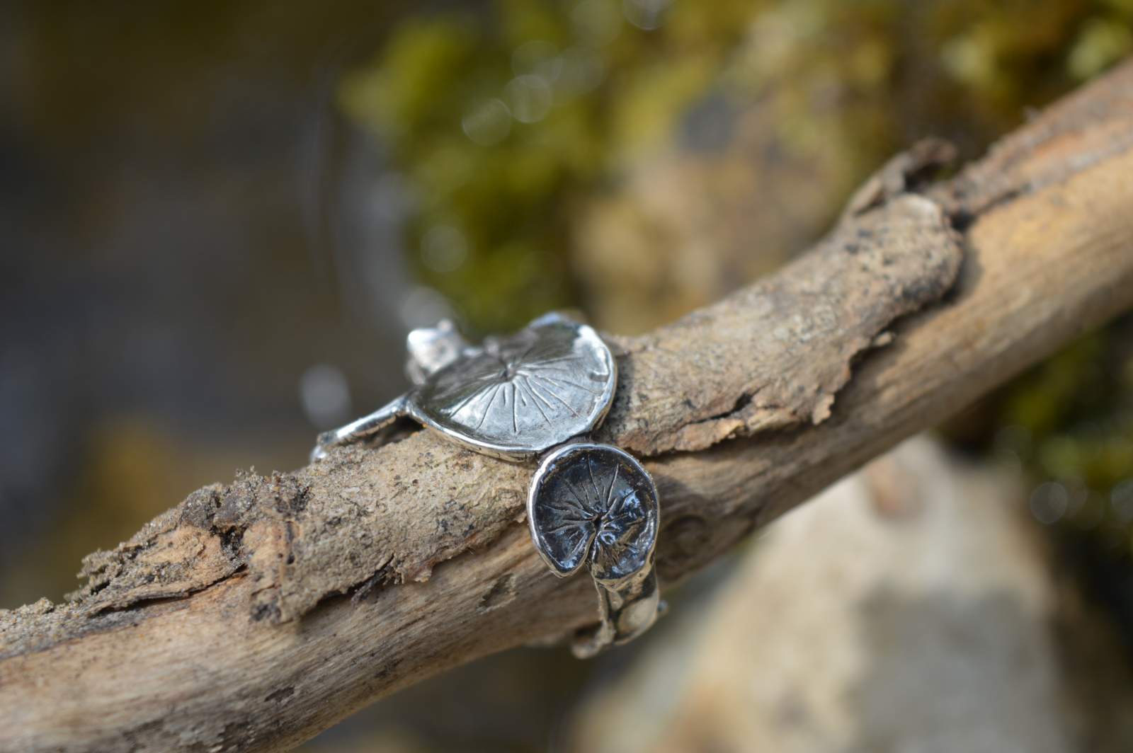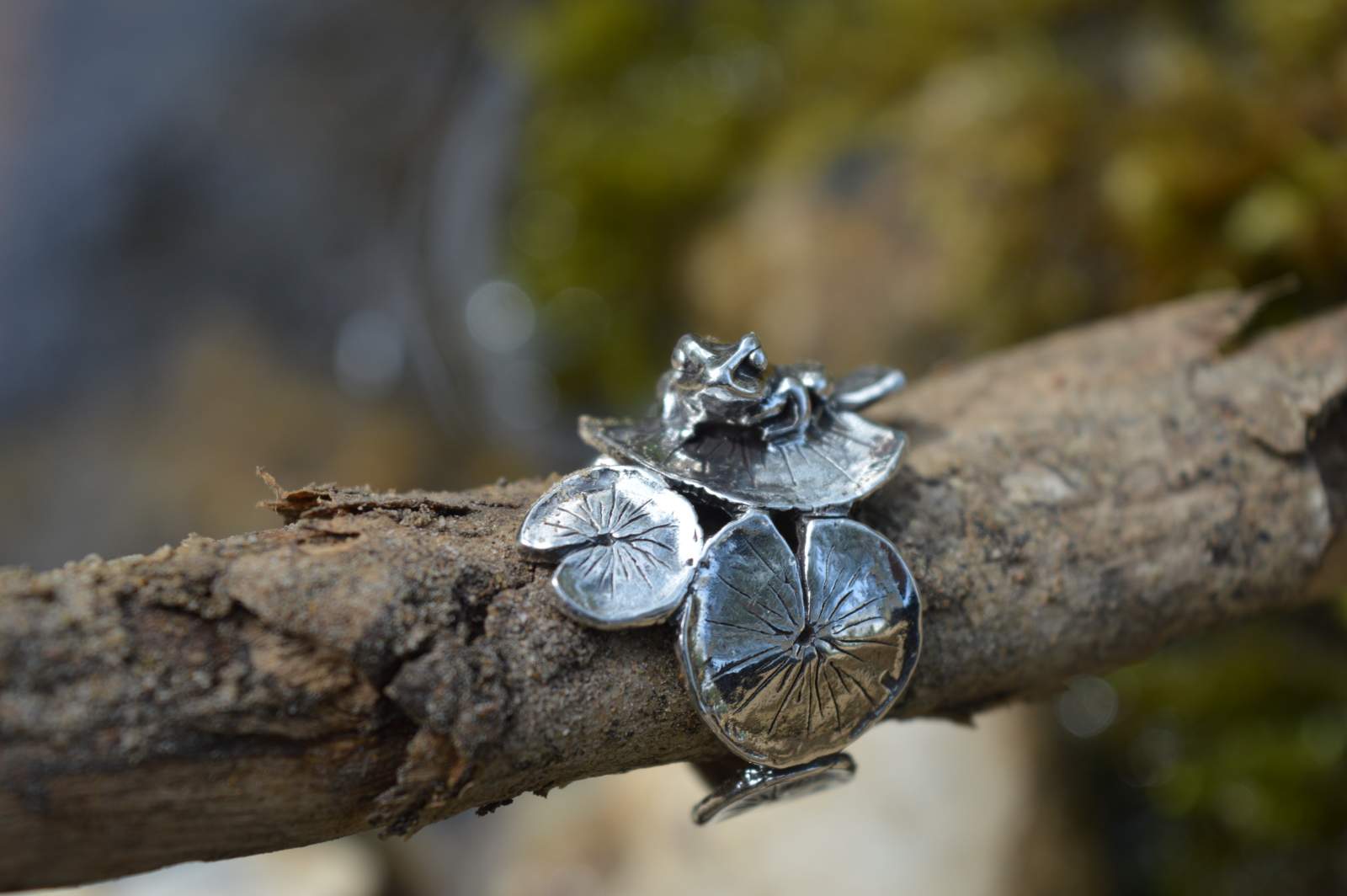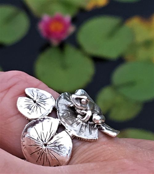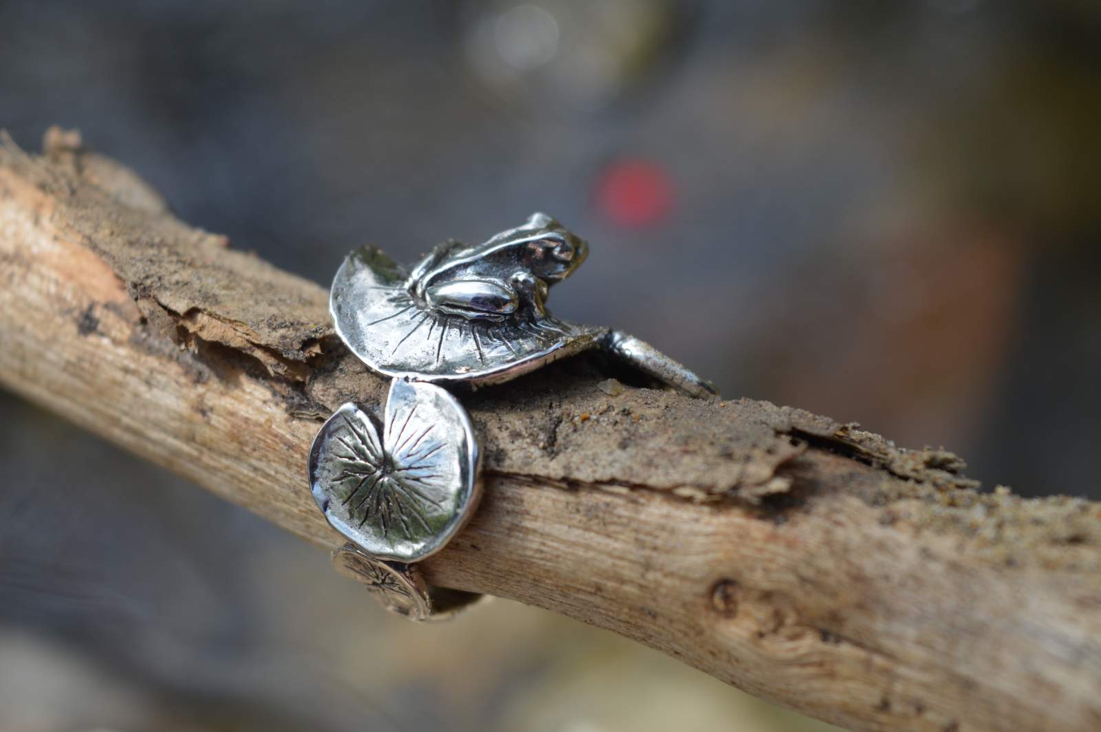 Some of my earliest sketchings, as a child, were of frogs. They always made me smile and I was itching to sculpt the archetypal common frog sitting on a lilypad. For a while, the wonderful shape of the tree frog diverted my attention. My tree frogs became so popular that I have now modelled them in all shapes and sizes, from tiny earrings to statement necklaces. A fortunate meeting led me back to my original love, the common frog, and to my frog and lilypad ring. Here is the story: