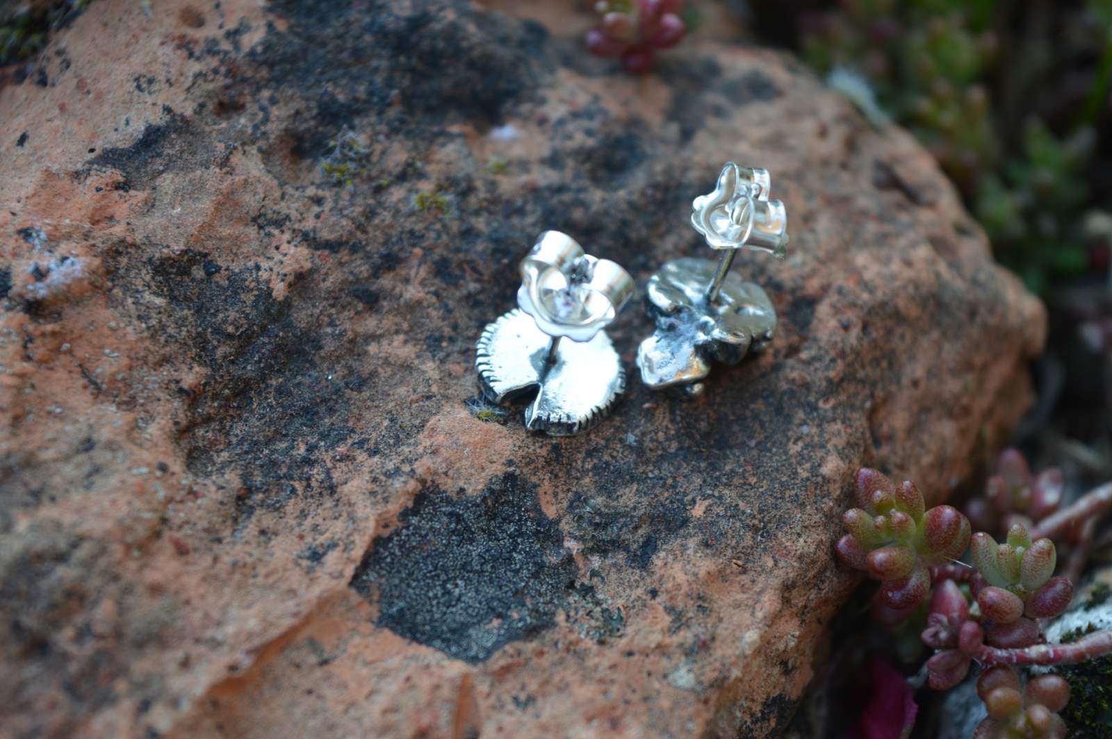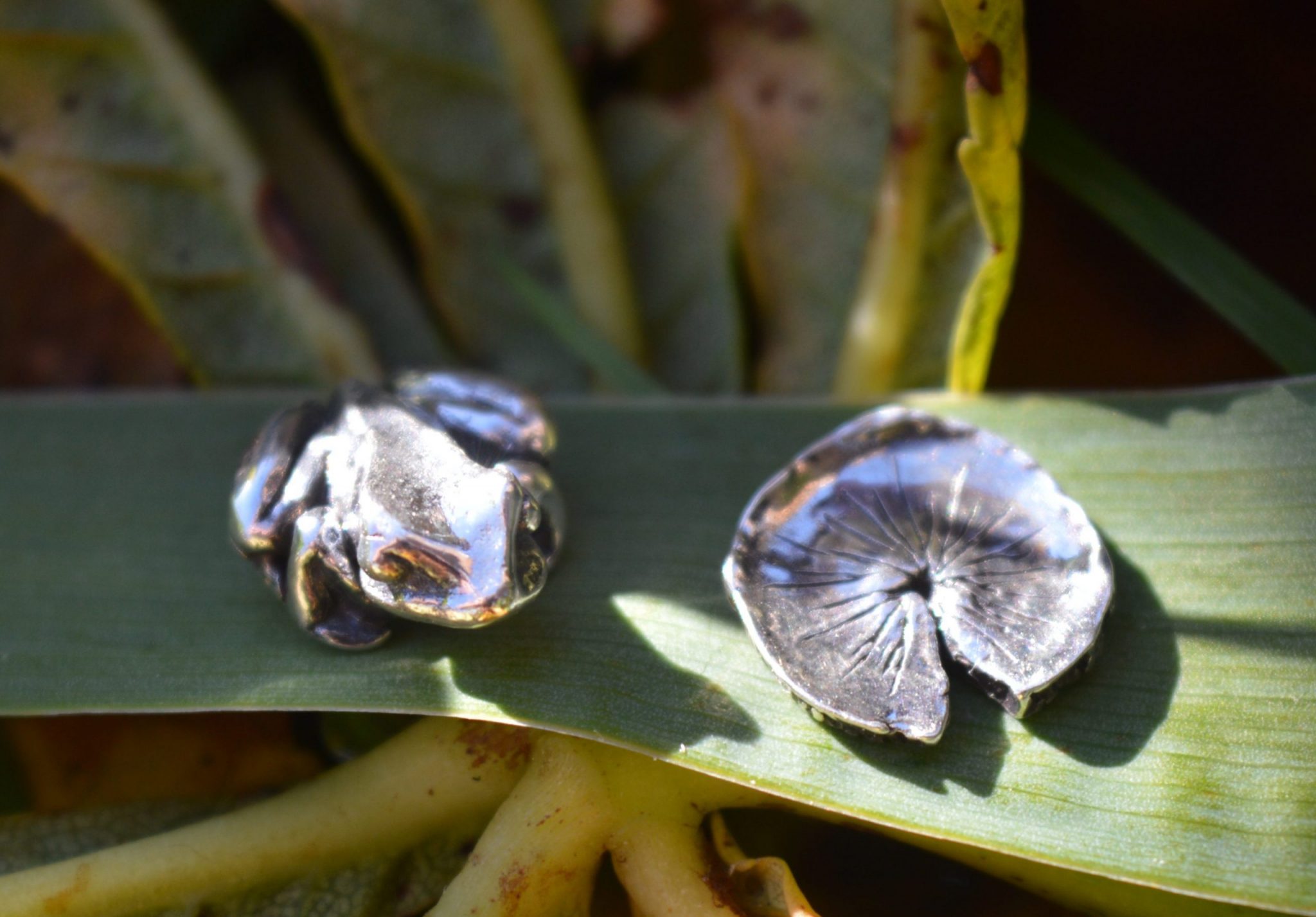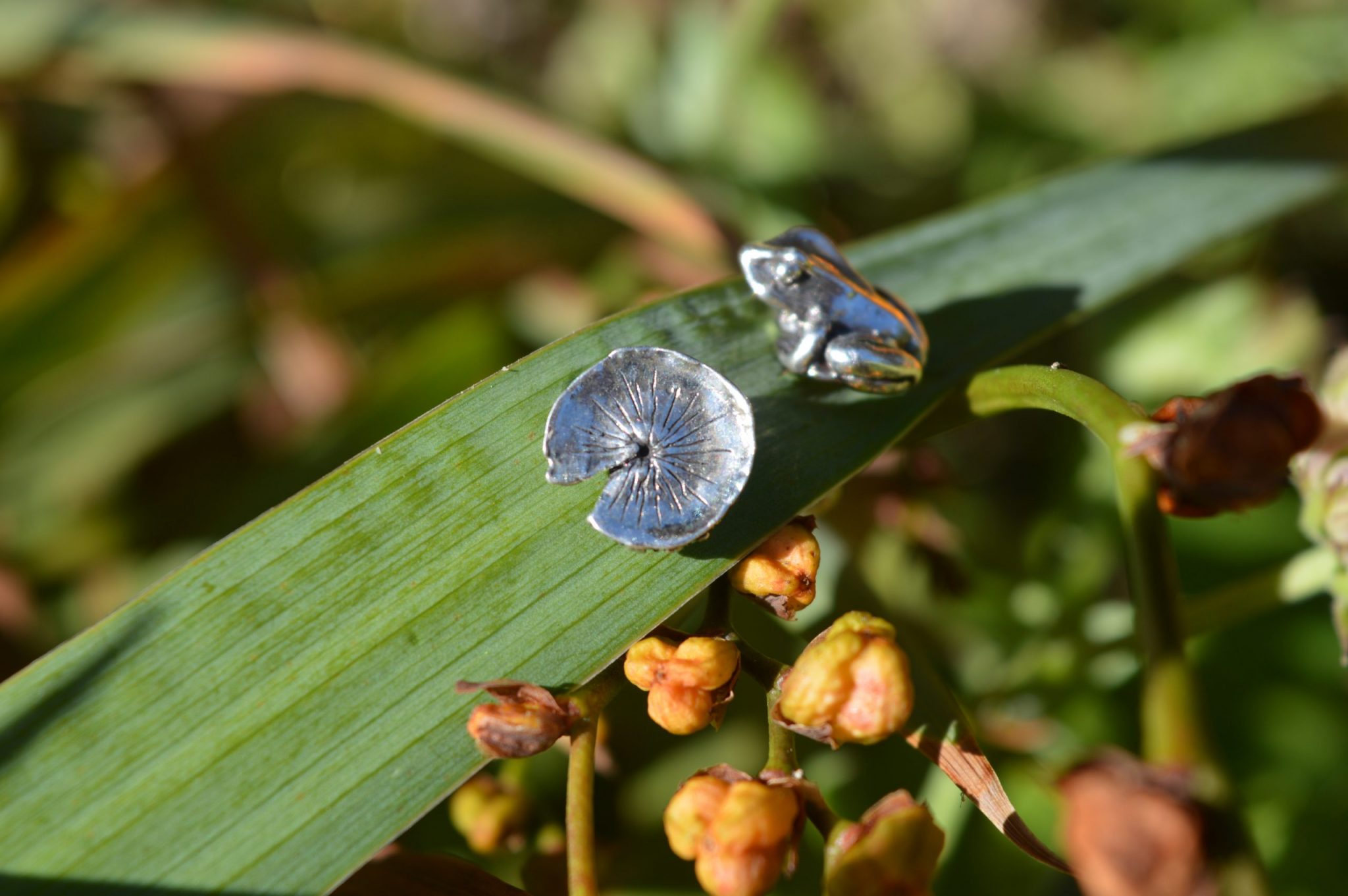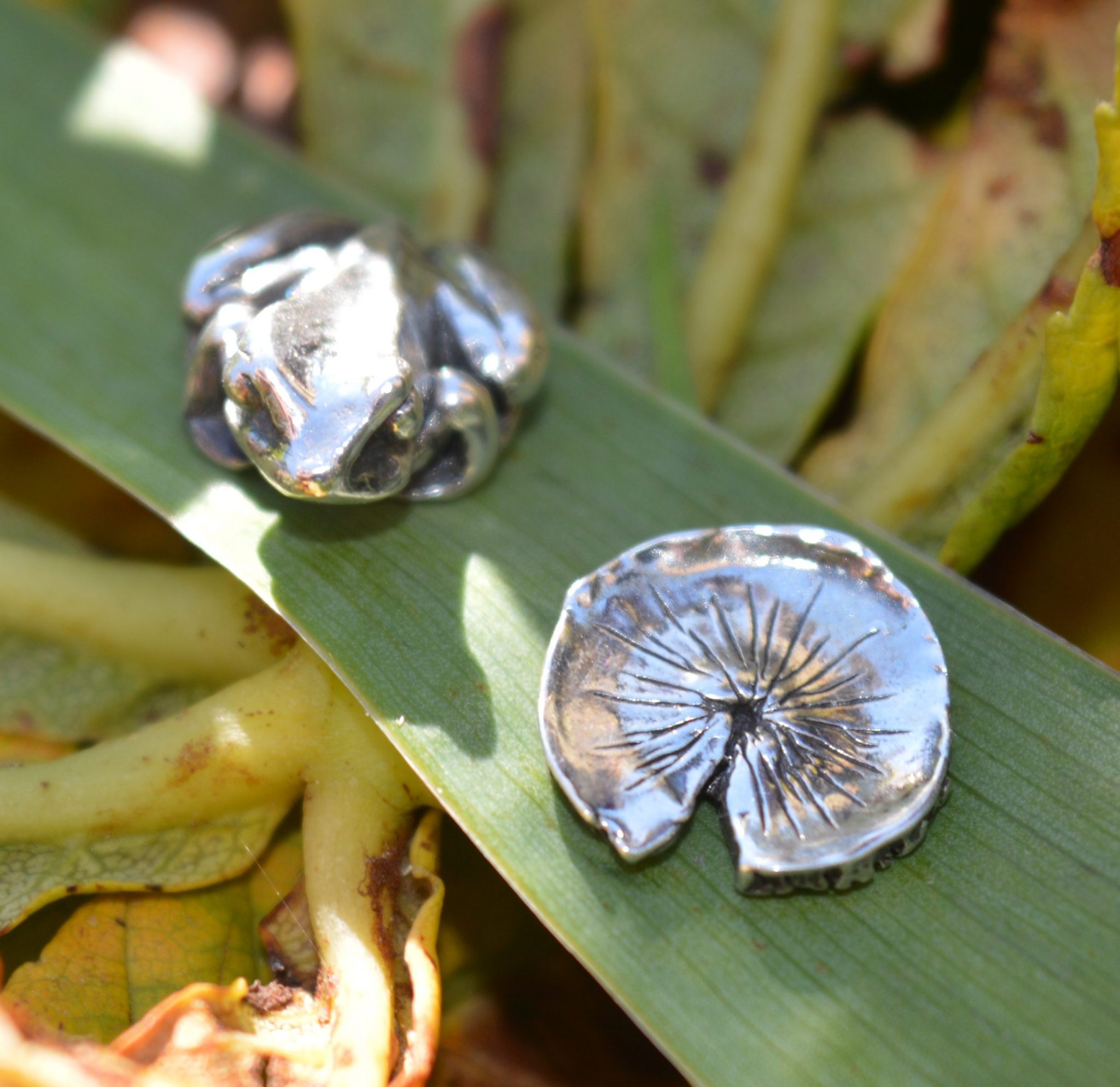 Some of my earliest sketchings, when I was a child, were of frogs. They always make me smile. So when I began silversmithing, I was itching to sculpt the archetypal common frog sitting on a lilypad. Having been initially wooed by the seductiveness of the Red-Eyed Tree Frog, I was brought back to my original love when asked to create a “Lucky Frog”, based on the common frog, from which these Frog and Lilypad Earrings were born. Here is the story: