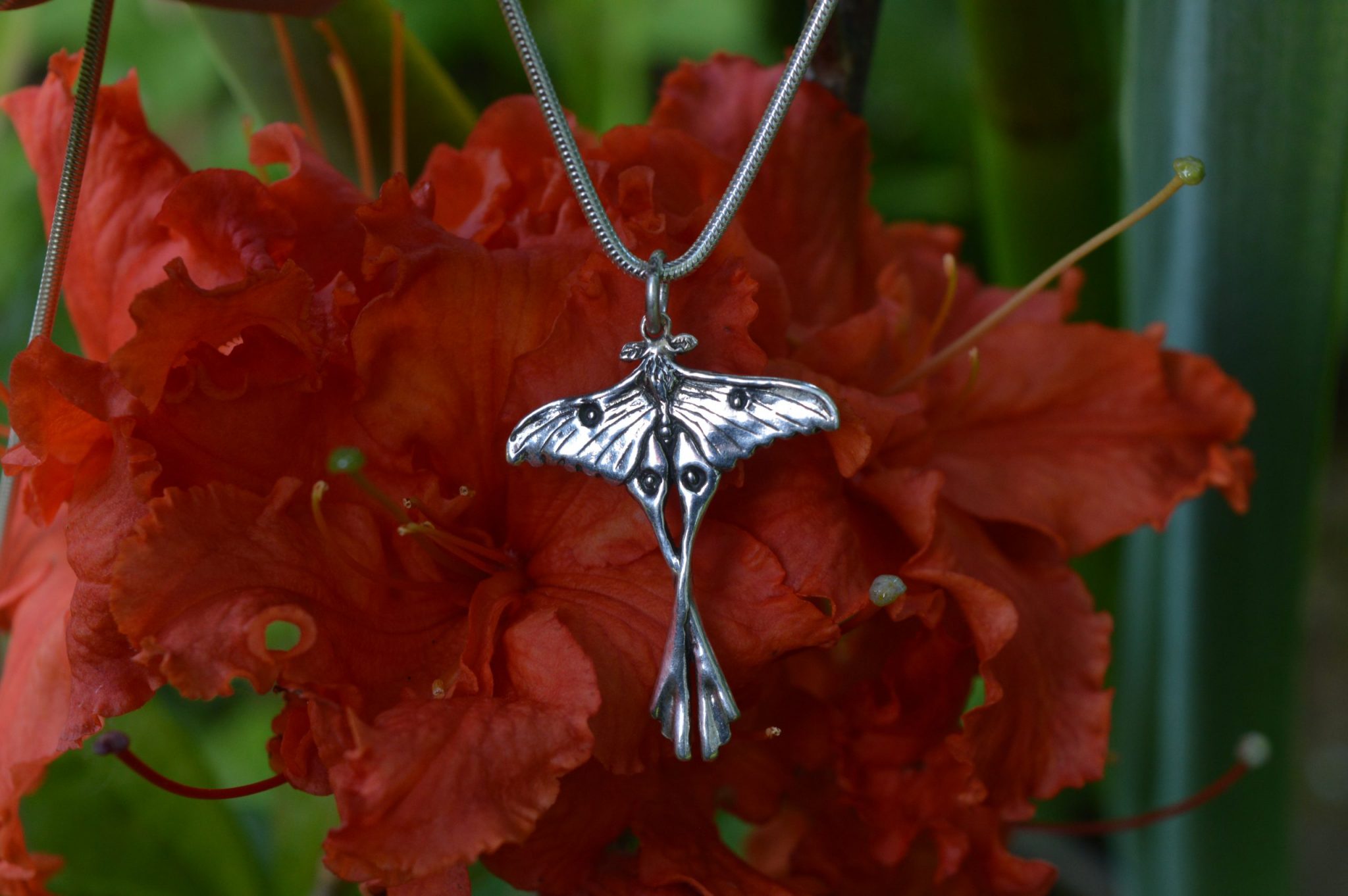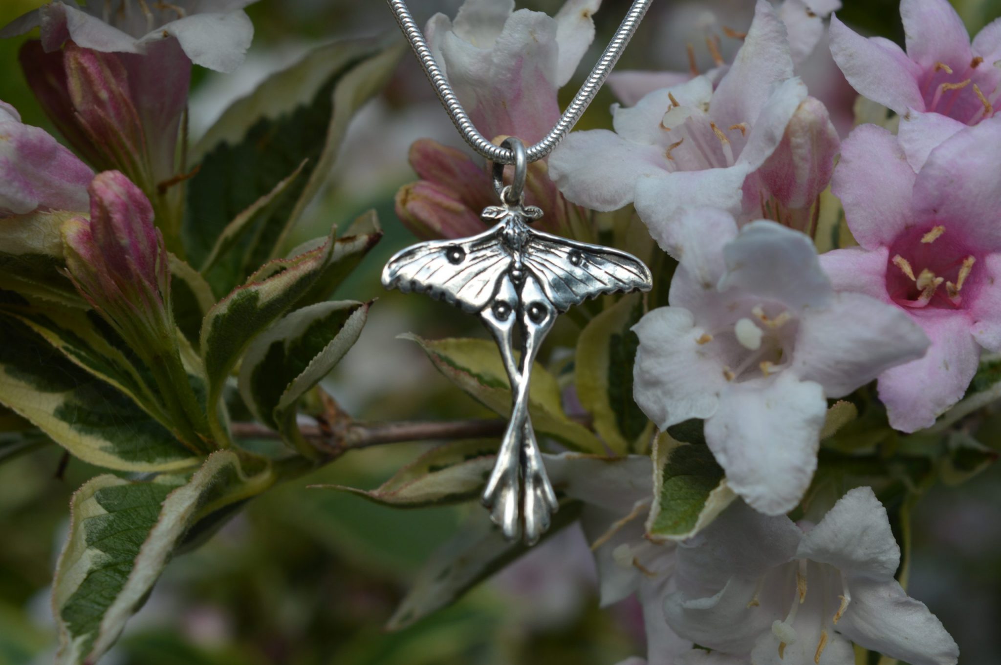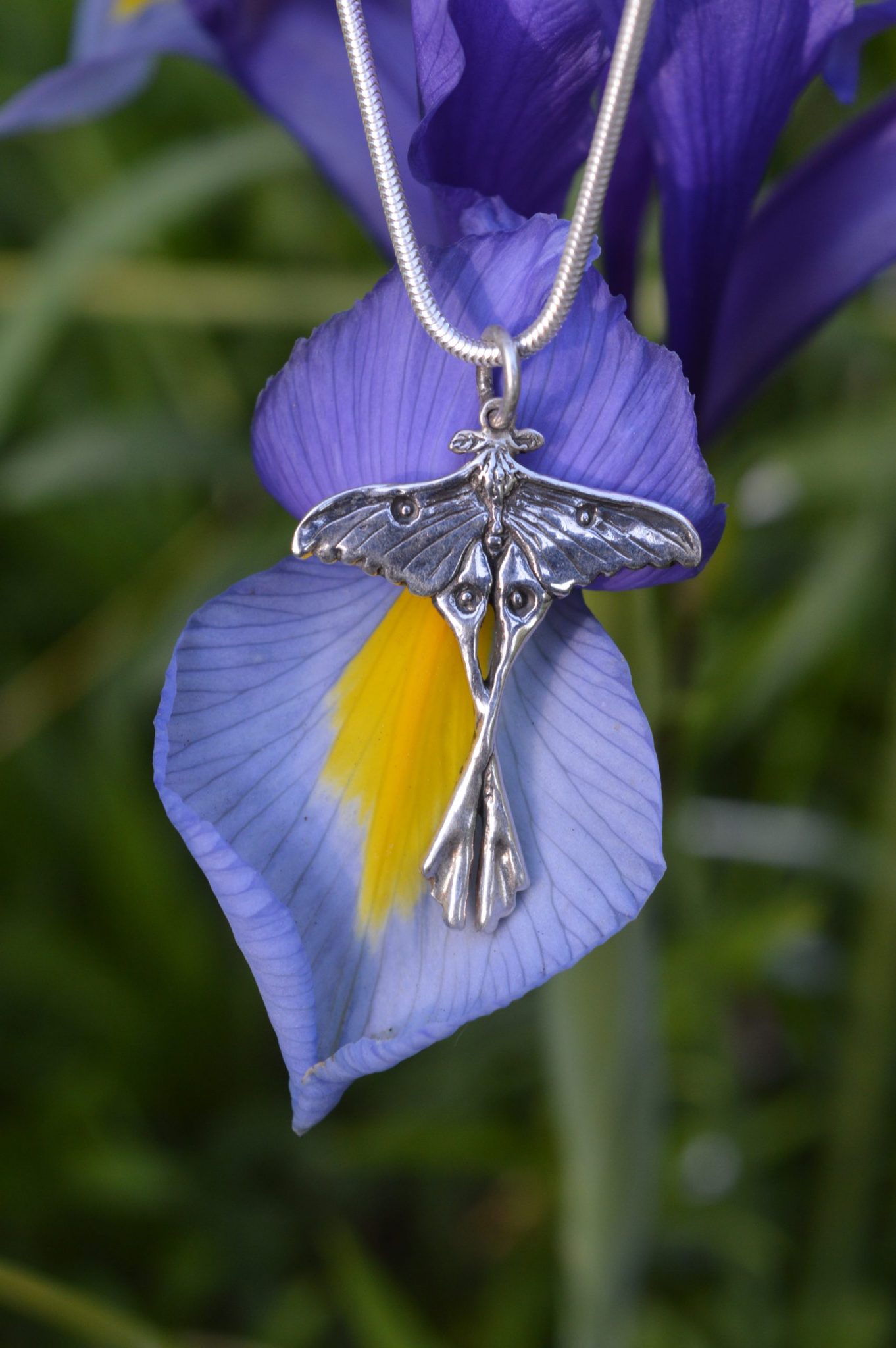 More recently. a customer loved her pendant so much that she asked if I would model matching Moon Moth Earrings. I was concerned that the beauty of the large moth wouldn’t translate into a smaller model – but I shouldn’t have worried. I have now extended my Moon Moth Collection to include this Mini Moon Moth Pendant.