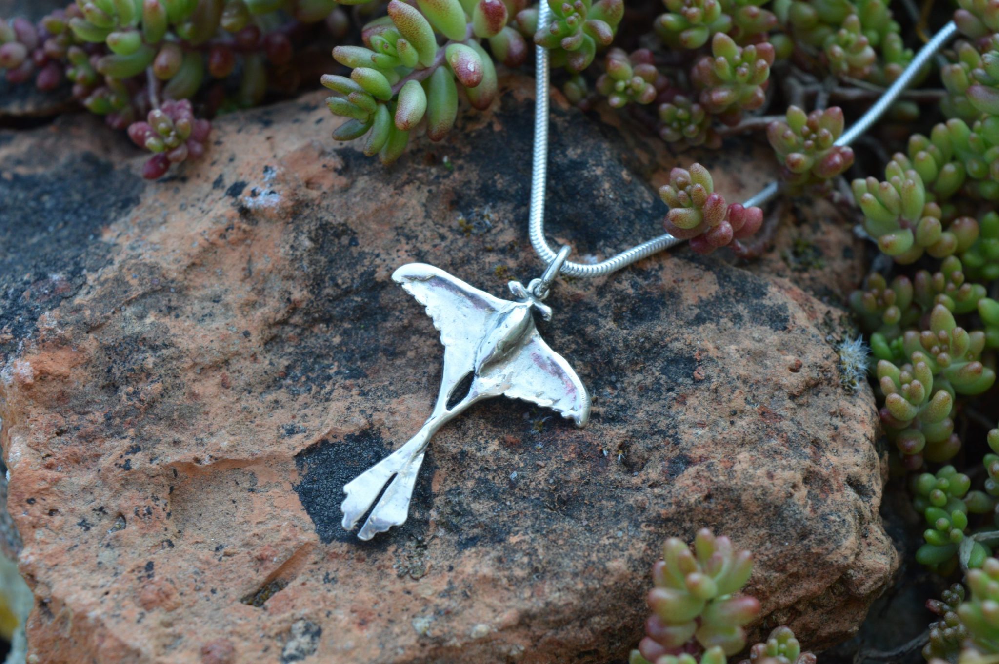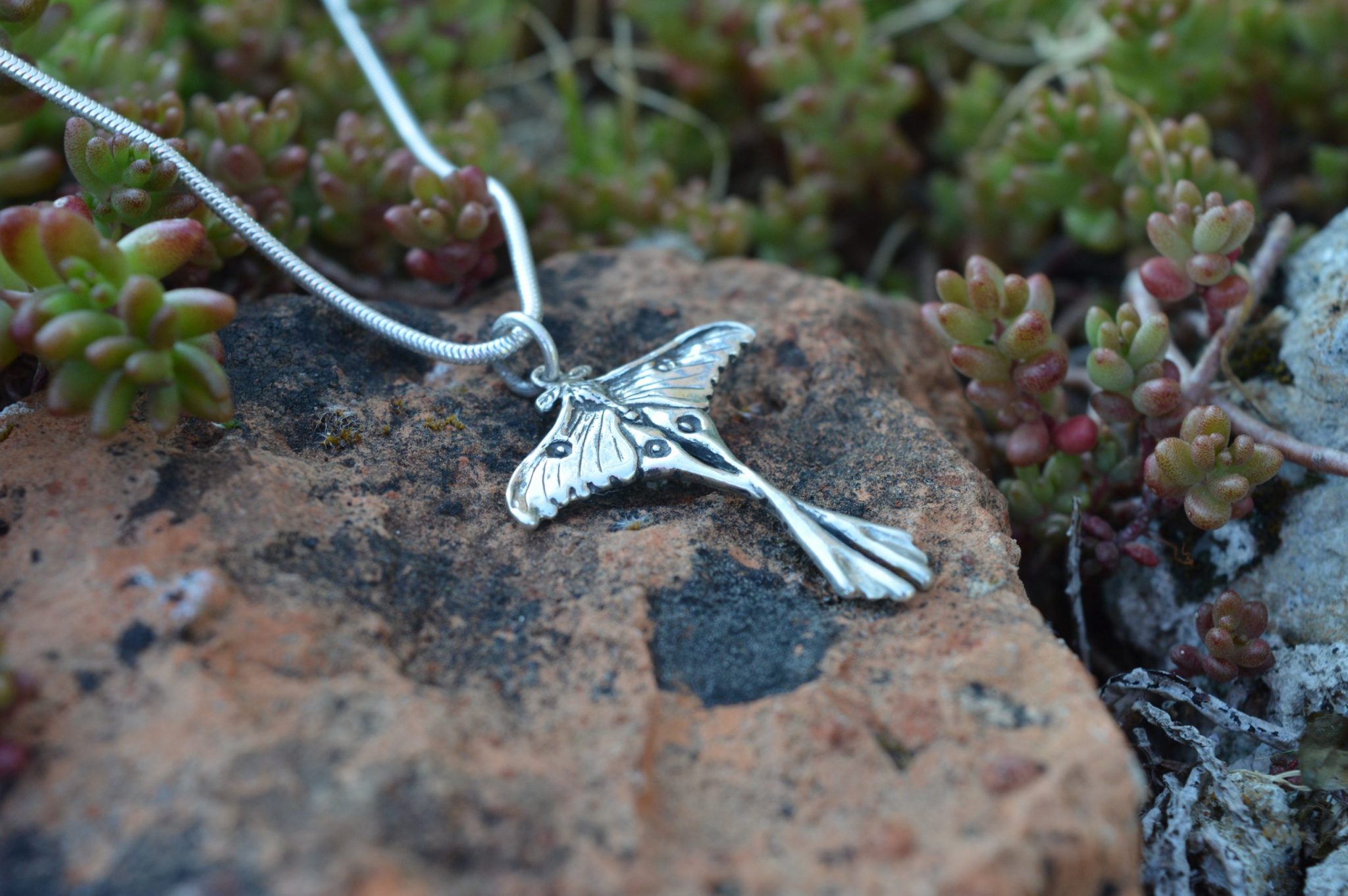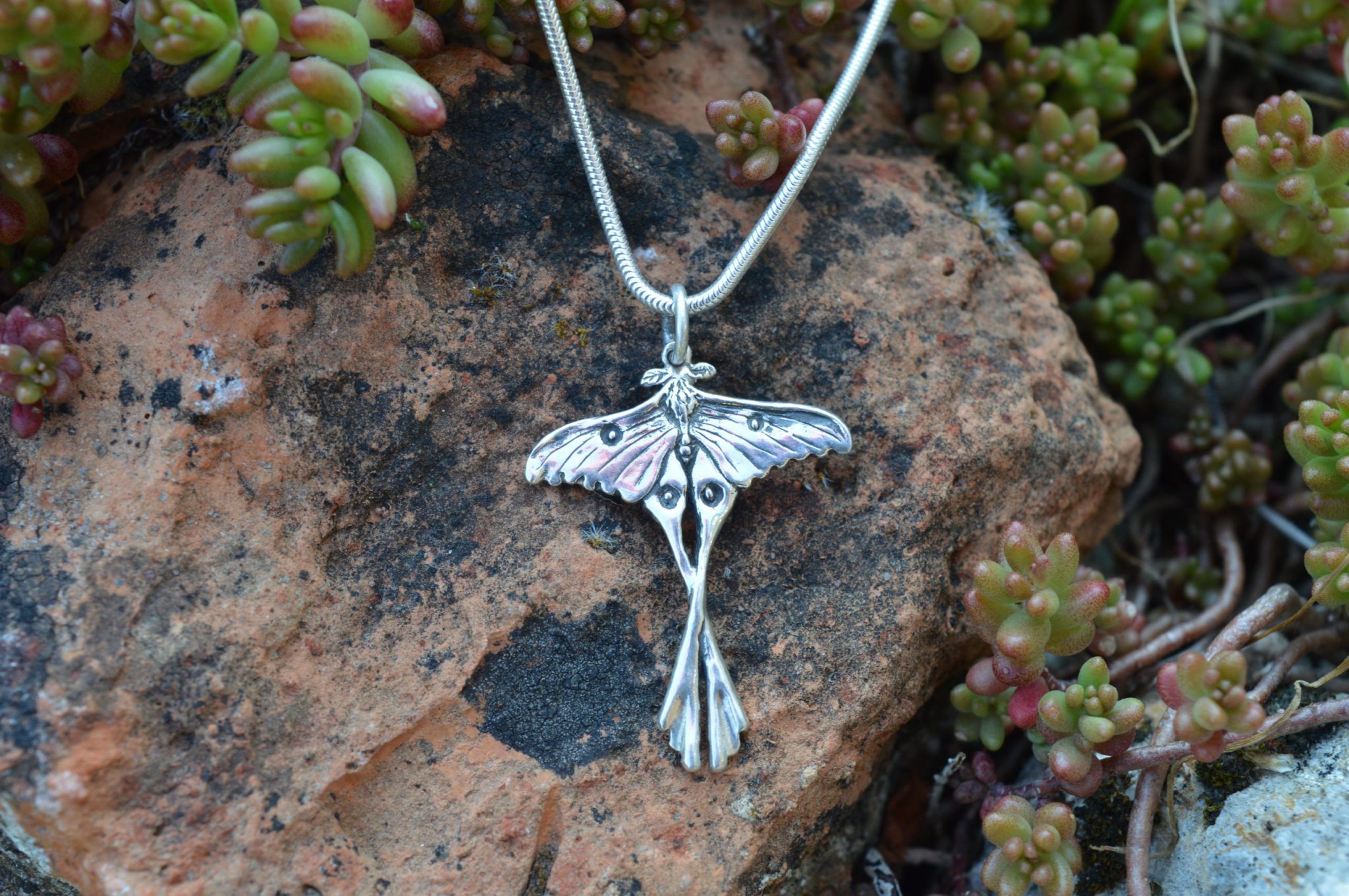 More recently. a customer loved her pendant so much that she asked if I would model matching Moon Moth Earrings. I was concerned that the beauty of the large moth wouldn’t translate into a smaller model – but I shouldn’t have worried. I have now extended my Moon Moth Collection to include this Mini Moon Moth Pendant.