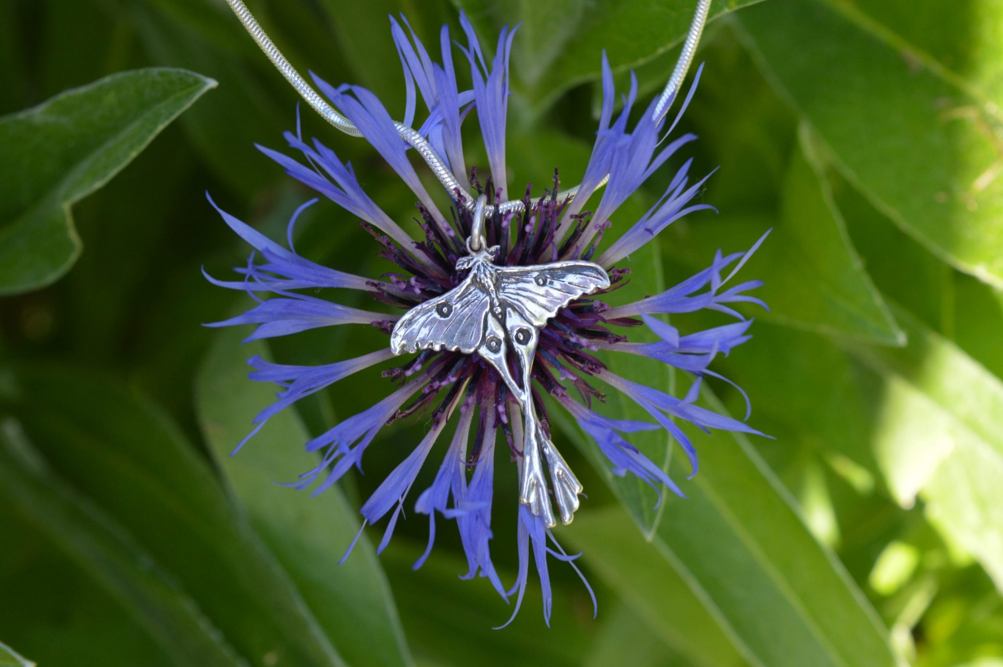 The Madagascan Moon Moth Pendant was one of my earliest statement necklaces. I have always asked people about their favourite creatures, particularly when meeting them at major fairs – and butterflies come up very regularly. However, much of their appeal lies in the intense beauty of their colourful wings, so I have always been more drawn to the less-celebrated moth. For a silver sculptor, moths hold a lot more intrigue for me: their furry bodies, large antennae and subtle but striking markings.