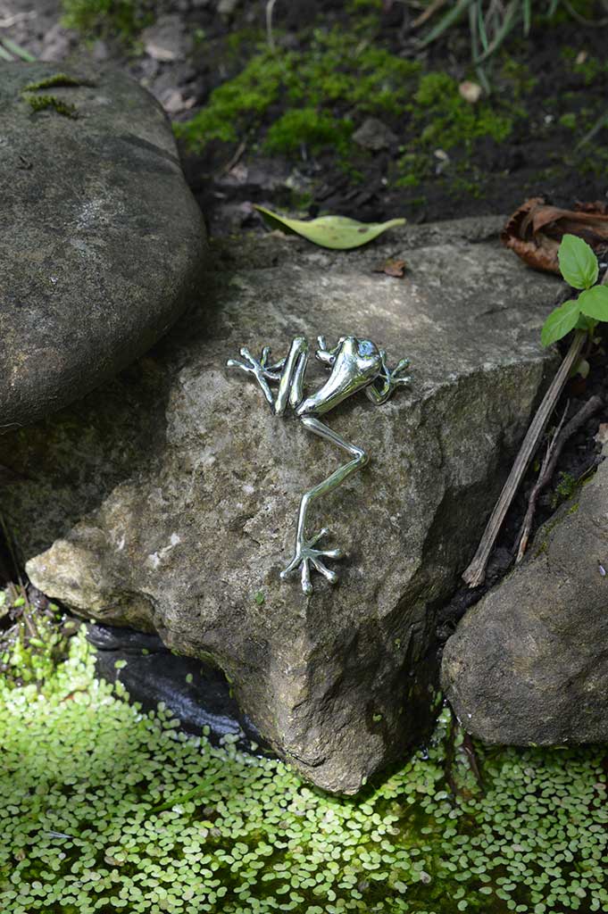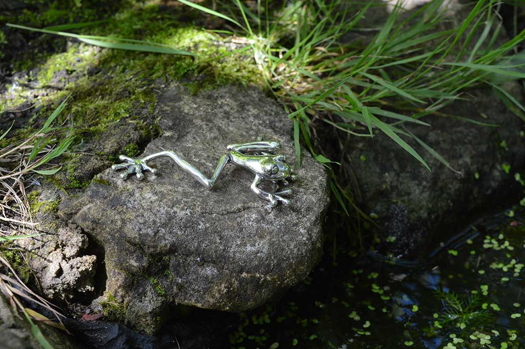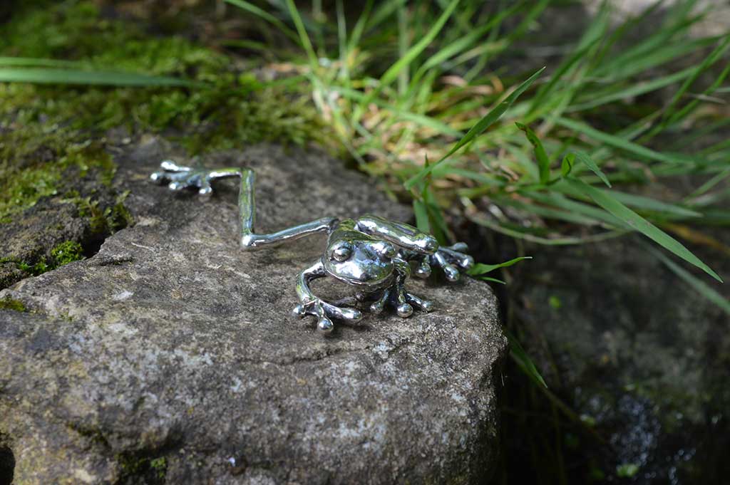 The model for this Tree Frog Ornament is a bit of a star in my collection. It was my first model and so is really the reason that the rest of the collection exists. When travelling up to Lexi Dick’s studio for my first go at wax modelling, I hadn’t really thought about what I was going to model. Frogs and lilypads featured strongly in my long-term jewellery sketchbook – so, when Lexi asked what I would model, the answer was frog. In my mind, I meant common frog – but I completely fell in love with a photo of a Red-Eyed Tree Frog in a perfect jewellery pose.
