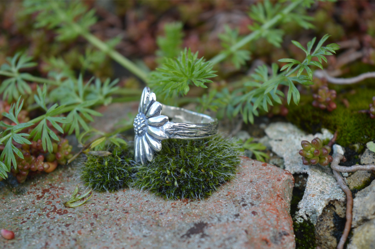 As well as bees being popular subjects for jewellery, I soon became aware that a simple daisy also waved a certain amount of magic. The first was my large Oxeye Daisy Pendant, and then ring – which continue to entrance people. But a more demure version was necessary, for those who wanted something that could be worn everyday. So a quick extraction of the bee from my bee & daisy ring, and hey presto!