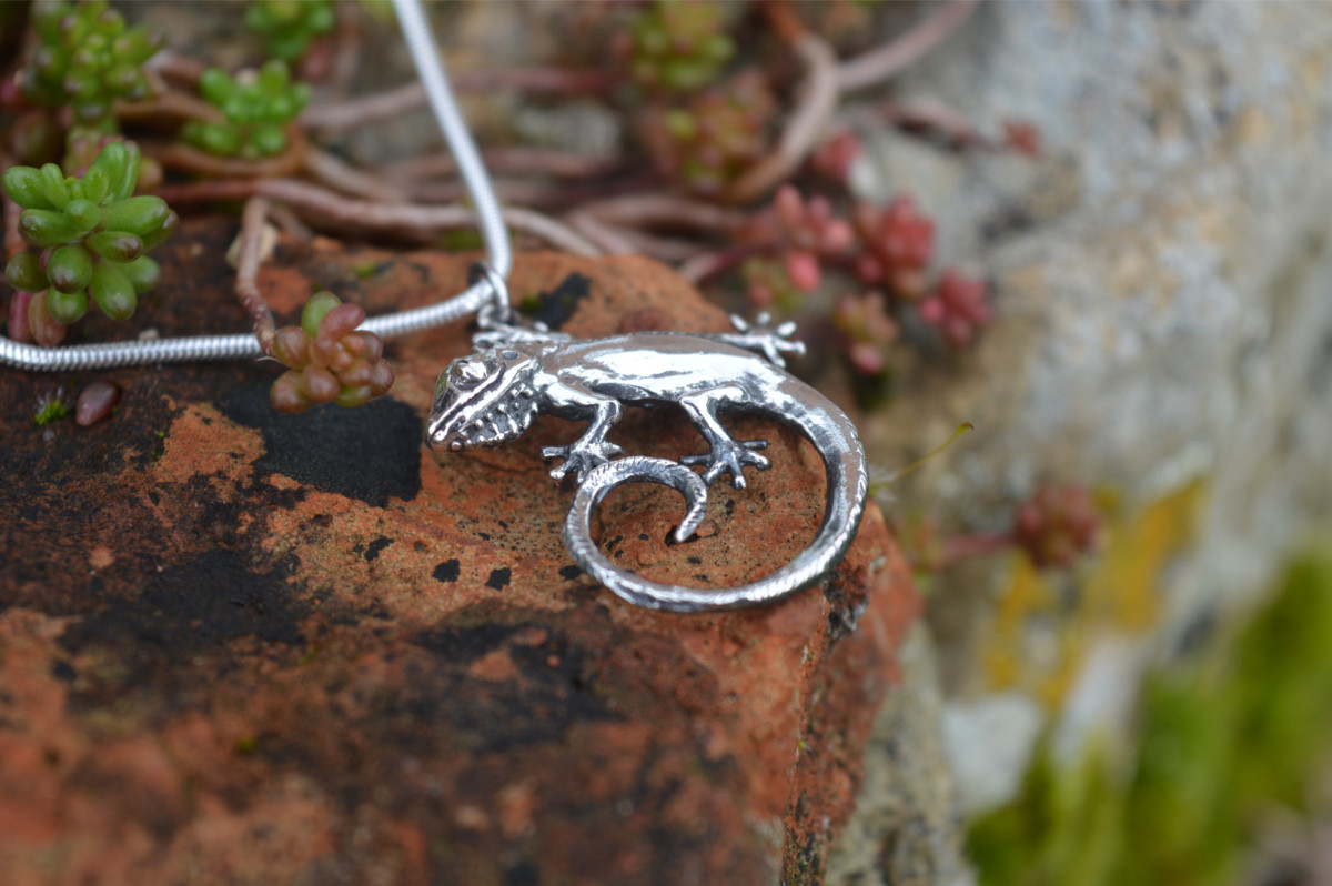 Sterling Silver small lizard pendant based on the Green Crested Lizard.