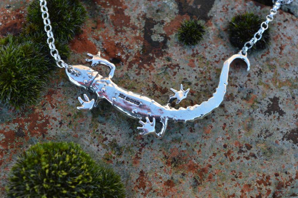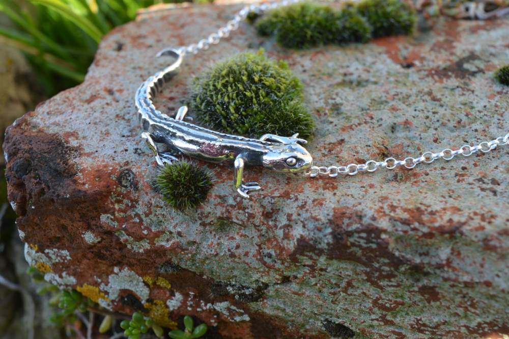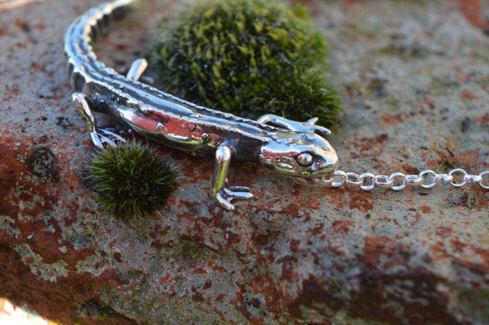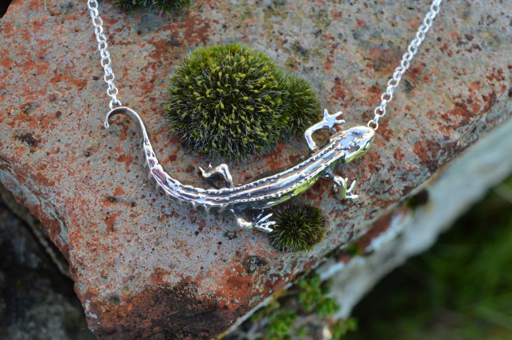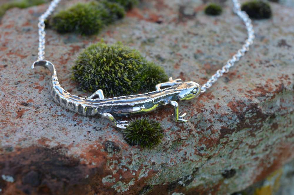 Also known as the common newt, this Smooth Newt Necklace was originally made as an ornament as part of a commemorative collection to mark a long and happy marriage, in which nature and wildlife played an important role. A female smooth newt had taken residence in their garden pond and obviously captured the hearts of this happy couple.
