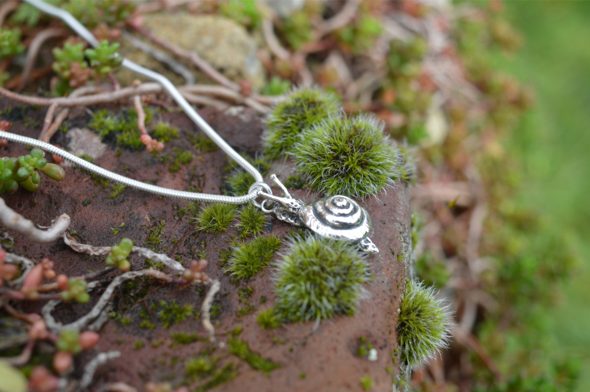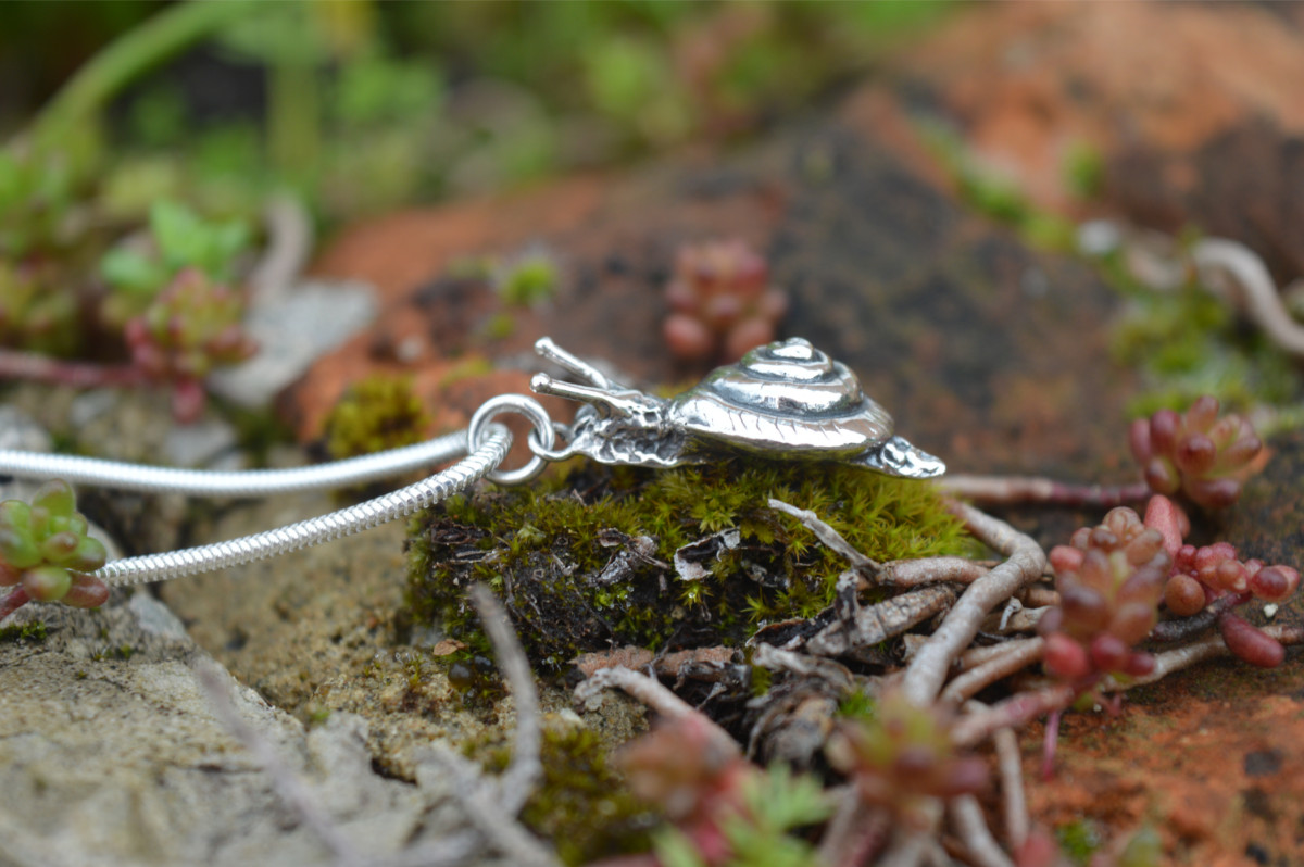 This little Girdled Snail Pendant was originally modelled to accompany my Black Slug as a pair of quirky earrings (Slug Earrings – Sterling Silver Studs – Emma Keating Jewellery). The intended recipient was a lady who so loved snails and slugs that she calls herself the “Slug and Snail Appreciation Society” on Instagram. Well she certainly made me look at slugs in a different light. Her mother originally commissioned a pair of slugs – but then the slug-snail combo seemed the perfect mix.