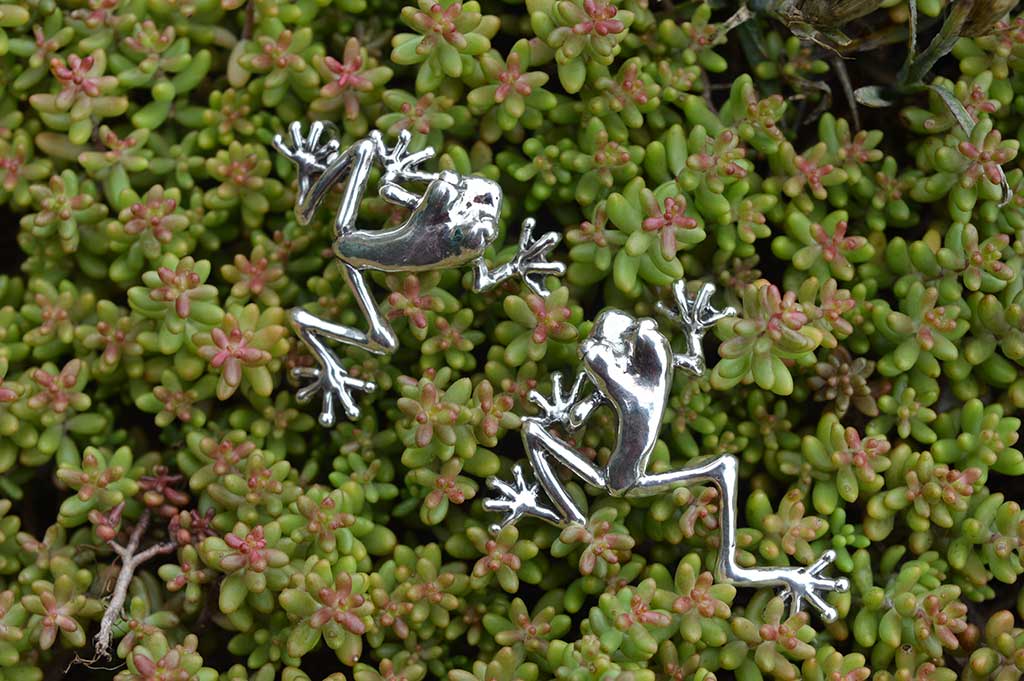 Once I finished my large frog, I had a cascade of requests for other tree frog themed jewellery – the first of which being Tree Frog Rings. Then, when asked for a smal tree frog pendant, I used as a starting point the wax of the side-facing tree frog ring. So you may spot a similarity in their faces… Like identical twins. The first version I modelled was the one with the leg tucked in. But inevitably, I received a request for a small version of Quasi – leg stretched out. And so now the choice is yours. These are the brooch versions.